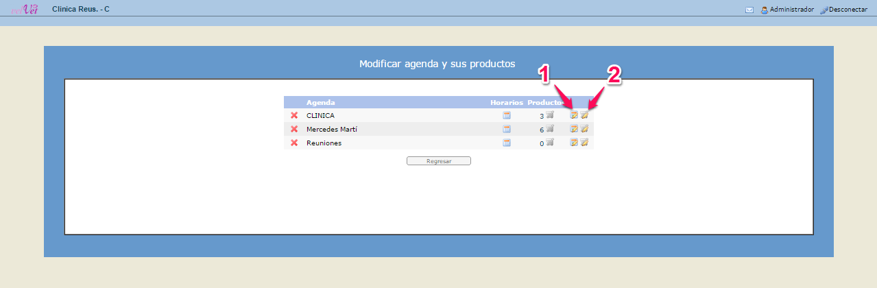 Si volem modificar els horaris, seleccionarem l'opció 1, i si volem modificar els productes de l'agenda, seleccionarem l'opció 2 de la imatge següent: