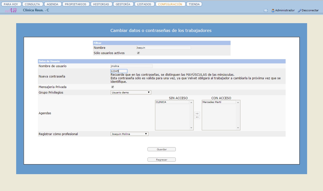 Com el seu propi nom indica permet gestionar les dades i contrasenyes dels treballadors. Únicament hem de seleccionar el treballador del que desitgem canviar les dades i modificar els apartats que ens interessin: el nom d'usuari, la contrasenya d'accés al programa, el grup de privilegis i les agendes a les quals té accés.
