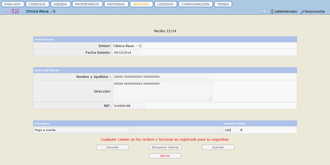 - Podem modificar el preu, la data d'emissió, les dades del pacient així com la informació i preus dels tractaments; recuperar els valors anteriors, esborrar una factura o desar els canvis fets. Per motius de seguretat qualsevol canvi realitzat en les factures o rebuts queda registrat.