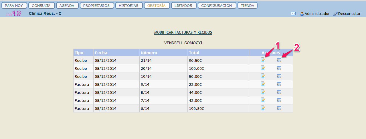 És l'apartat que ens permet modificar les factures i rebuts ja emesos. Podem filtrar la informació per pacients de tal manera que quan seleccionem el pacient ens apareixerà un llistat amb tots els documents – factures i rebuts- que s'hagin emès per aquesta persona. En el llistat apareix la següent informació: si es tracta d'una factura o un rebut, la data, el nombre de factura o rebut i la quantitat de diners. Les accions que podem dur a terme són dues: