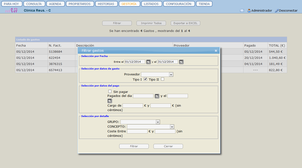 Tindrem l'opció de filtrar la recerca de les despeses per data, per les dades de la despesa, per les dades del pagament o per una secció detallada, tal com veurem en la següent imatge: