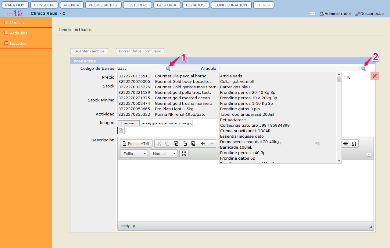 2. Busca l'Article pel nom, on també hi tenim un desplegable, per el cas que no ens enrecordem del nom exacte.
