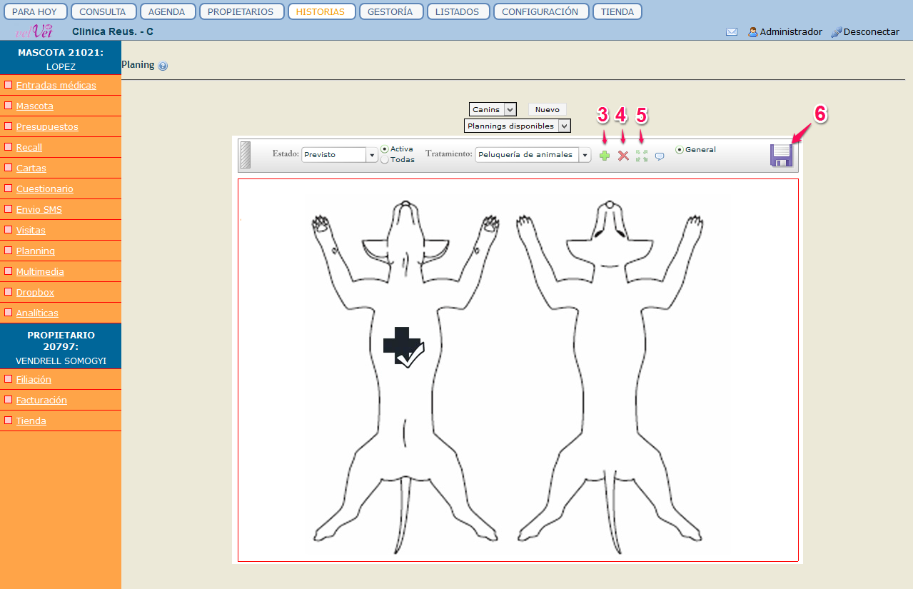 Les accions que podem realitzar són les pròpies de la creació d'un pressupost: afegir un nou tractament (3), eliminar un tractament (4), moure un tractament (5) i finalment guardar el pressupost (6).