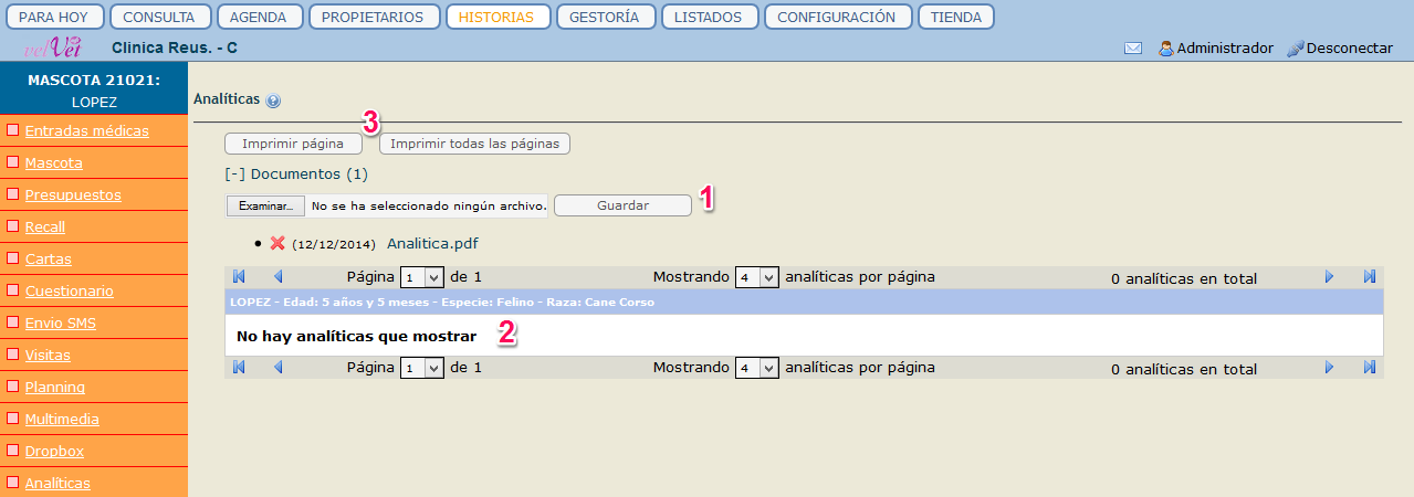 En aquest apartat podrem adjuntar i consultar les analítiques de la mascota:
