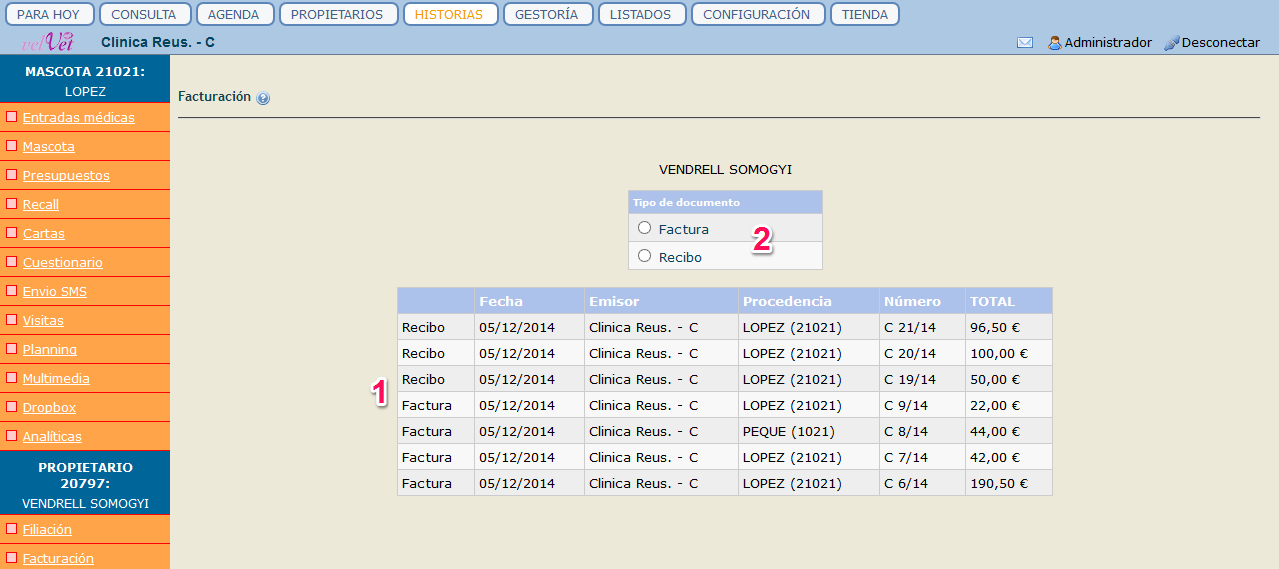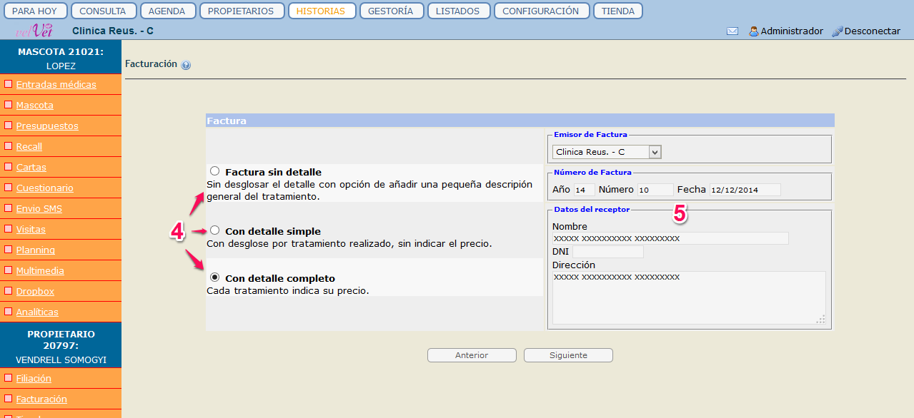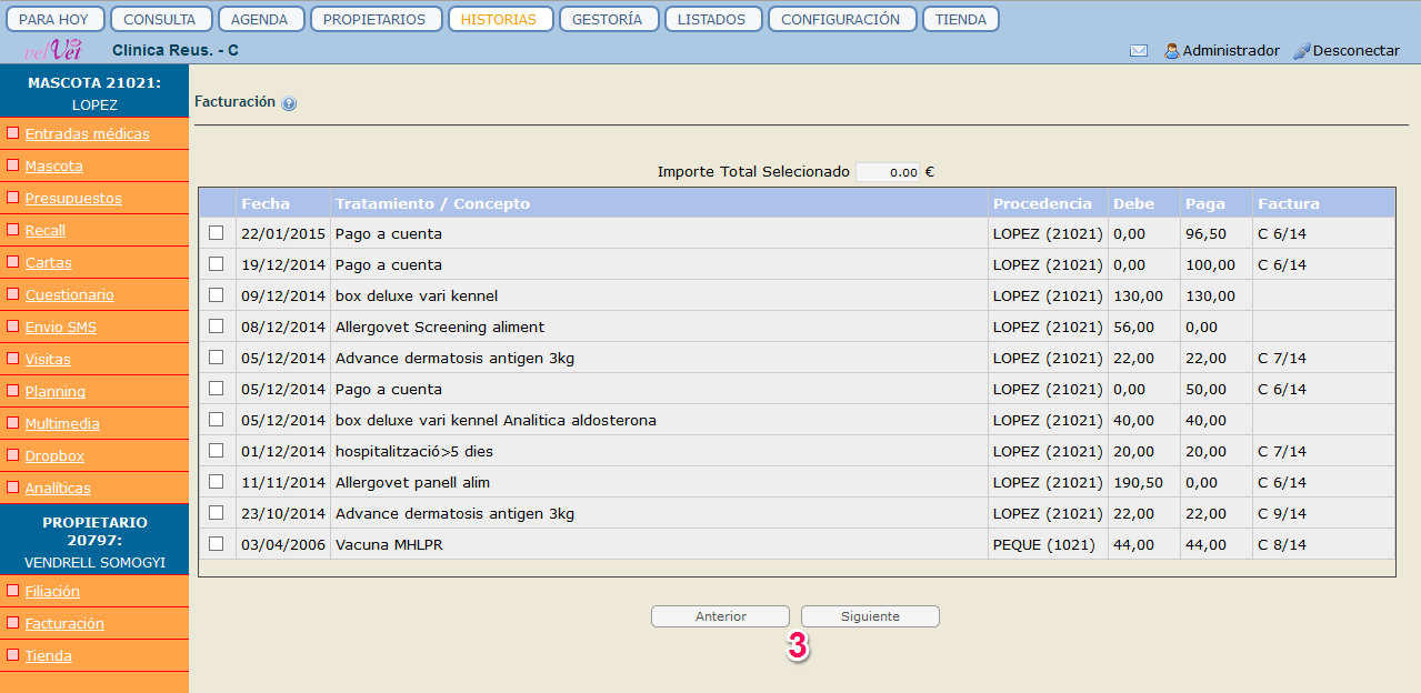 A sobre d'aquest llistat tenim una taula de selecció de document (2) – factura o rebut – per escollir quin tipus de document volem generar o modificar. Quan fem clic en una de les dues opcions s'obre un llistat dels tractaments que han rebut les mascotes d'aquest propietari. La informació sobre cada tractament es refereix a la data, el nom del tractament, el preu i si està o no facturat.Sempre hi ha la possibilitat de començar de nou el procés clicant a "Anterior" o de seguir amb l'acció clicant a "Següent" (3).
