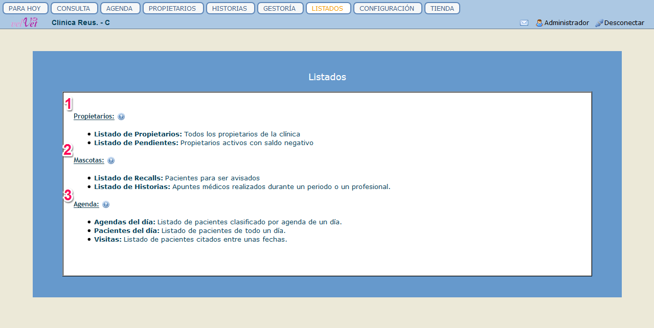 Trobem tres tipus de llistats en aquest menú: els que fan referència als llistats segons els propietaris (1), la segona són els llistats que fan referència a les mascotes (2) i la tercera són els llistats que fan referència a les agendes (3). Aquests llistats faciliten molt la feina dels administratius i metges a l'hora de fer comunicacions – enviament de cartes, SMS, contacte telefònic – amb els propietaris o també per aconseguir informació sobre la clínica.
