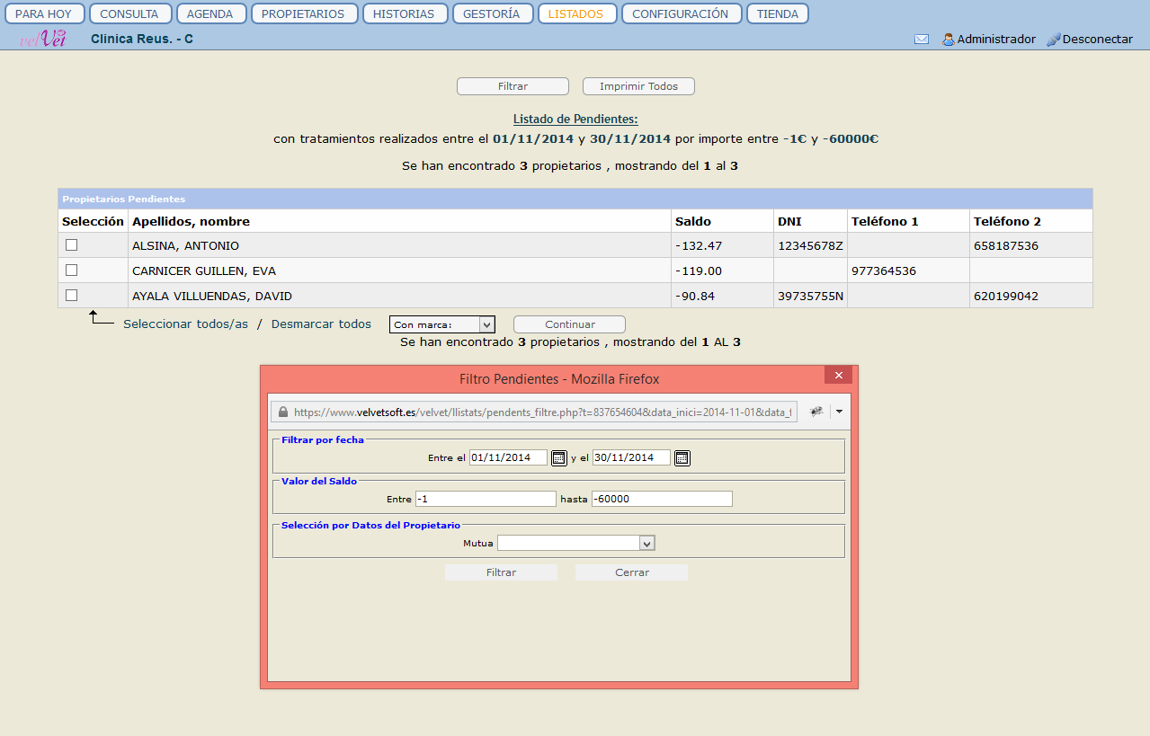 En aquest apartat podem aconseguir llistats de tots els propietaris que deuen diners a la clínica. Vegeu un exemple en la següent imatge: