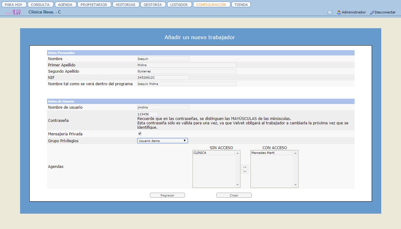 Per a donar d'alta un nou usuari del Velvet soft necessitem completar les seves dades personals  així com les seves dades d'usuari . Per a completar el donar d'alta a un treballador escollim les agendes a les quals tindrà accés tal i com podem veure a la següent imatge: